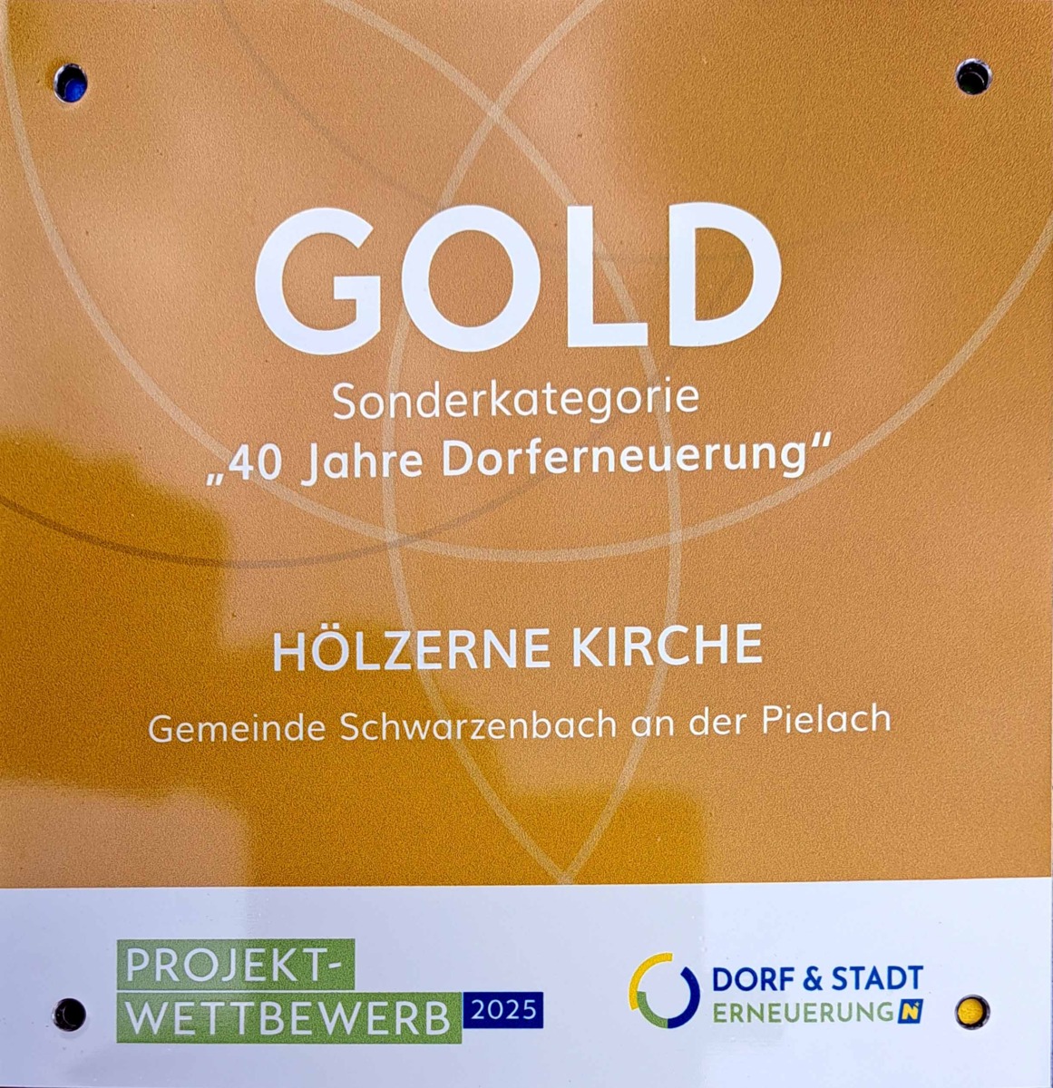Für das Projekt “Sanierung der Hölzernen Kirche” wurde der Gemeinde die Ehrentafel in Gold im Rahmen der Sonderkategorie “40 Jahre Dorferneuerung” verliehen.
