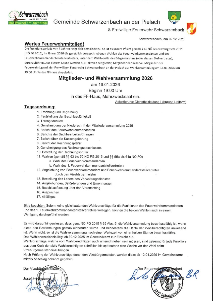 FF- und Mehrzweckgebäude Brunnrotte 18, Schwarzenbach/Pielach, ÖsterreichJagdabrechnung; Einladung Im Namen der Jagdgesellschaft lädt Jagdleiter Alfred Wagenhofer a l l e Mitpächter, Jagdkameraden, Genossenschaftsmitglieder, Vorbesitzer und Treiber sowie deren Ehefrauen bzw. Lebensgefährten zur „Jagdrechnung 2025“ mit einem Essen für Sonntag, 18. Jänner 2026, nach der Sonntagsmesse (ca. 11 Uhr) in den Mehrzwecksaal, Brunnrotte 18, herzlich ein.